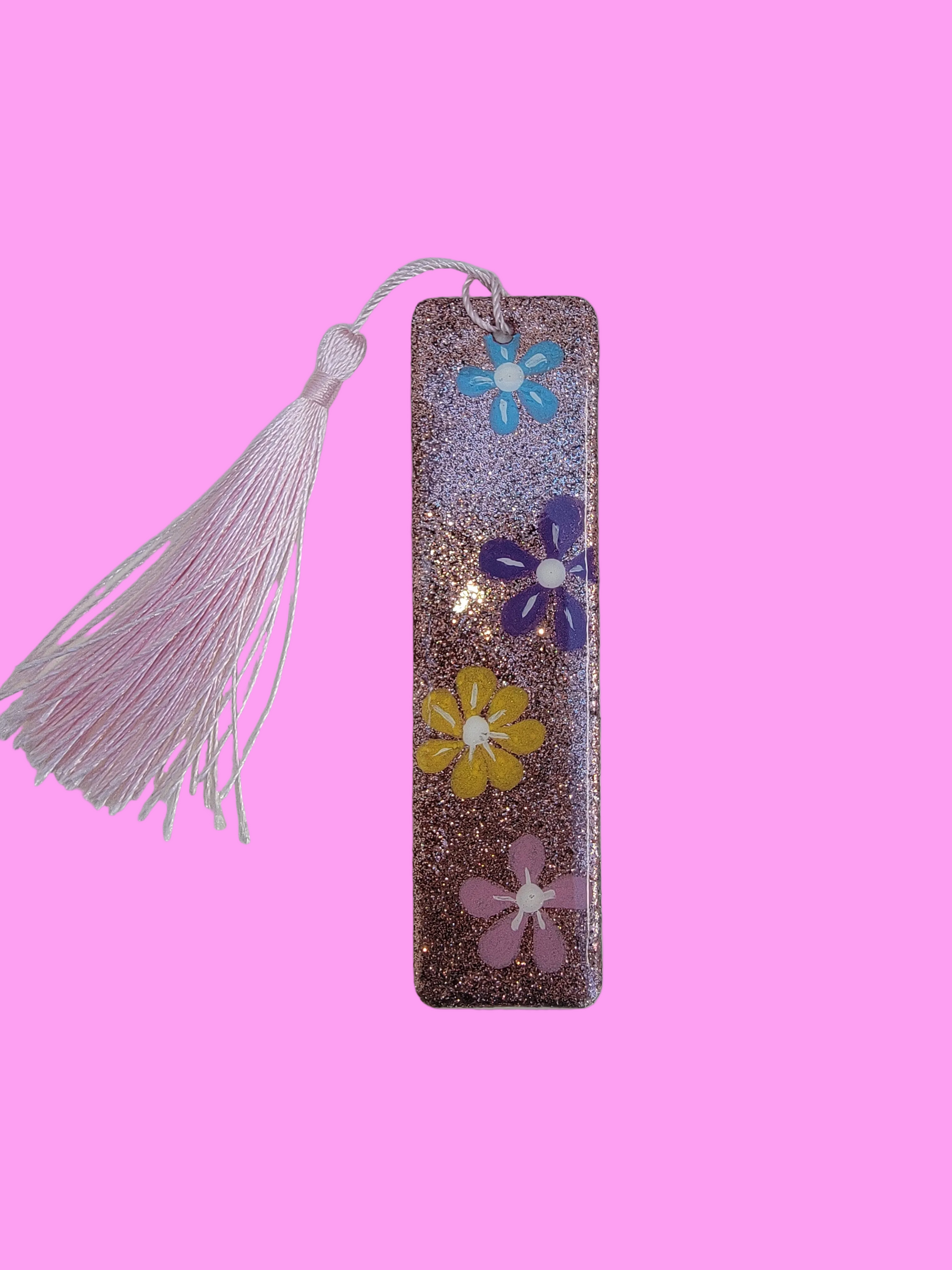 Rose gold glitter book marker with hand painted different color flowers with pink tassel, 4.7 in/12cm × 1.2in/3.2cm